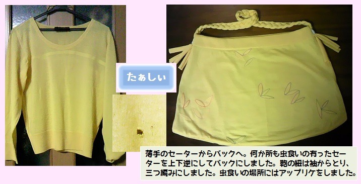 文化服装学院アパレルデザイン科卒業。同学院助手4年。子育て中より、洋服のお直しを始める。現在、洋服のお直し・リフォーム・リメイクの傍ら、「あなたの作りたい!創りたい!造りたい!を応援します。」のキャッチフレーズのもと、”たぁしぃの手仕事教室”も不定期開催。