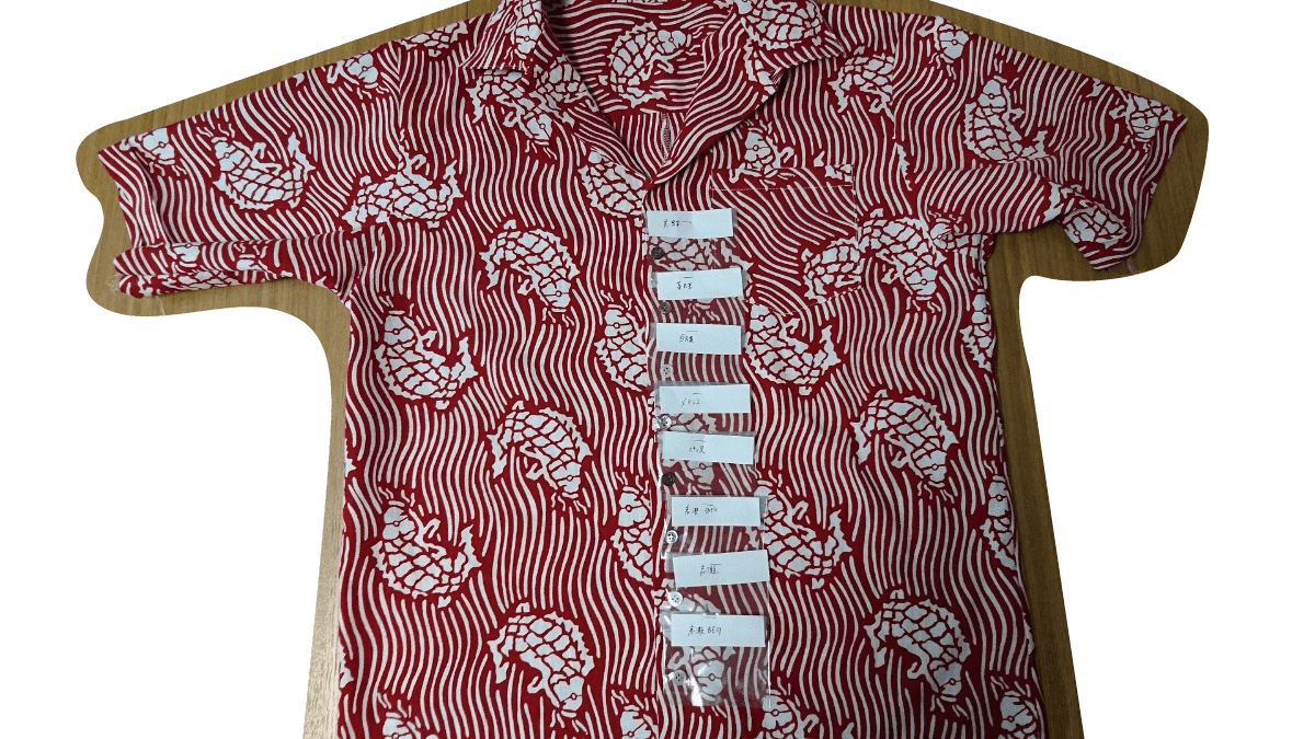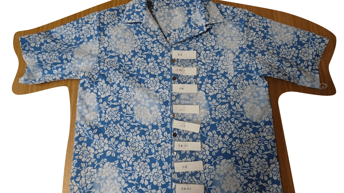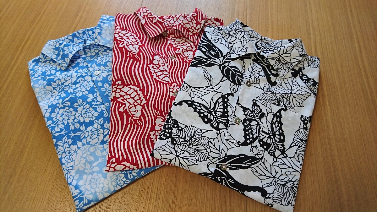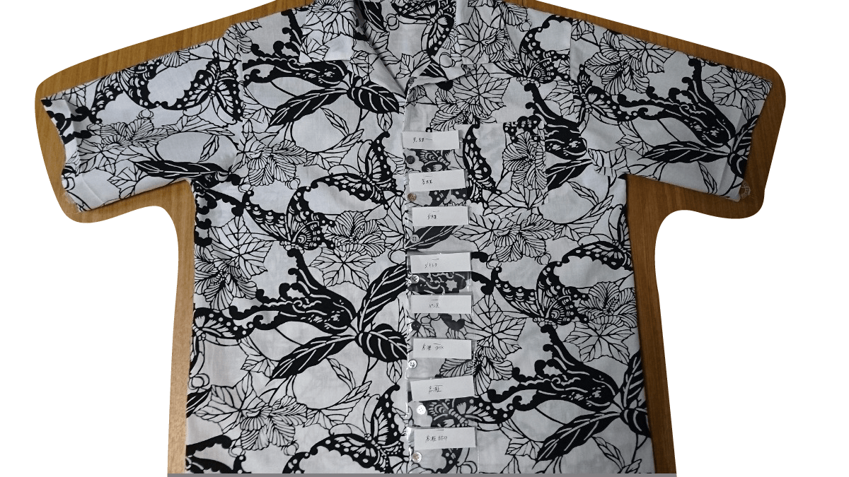 アロハシャツ(オリジナル柄・染色手ぬぐい) パターン作成 副資材手配 手ぬぐい生地で縫製