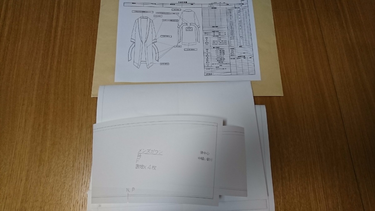 メンズガウン 写真画像からパターン作成 縫製仕様書作成
