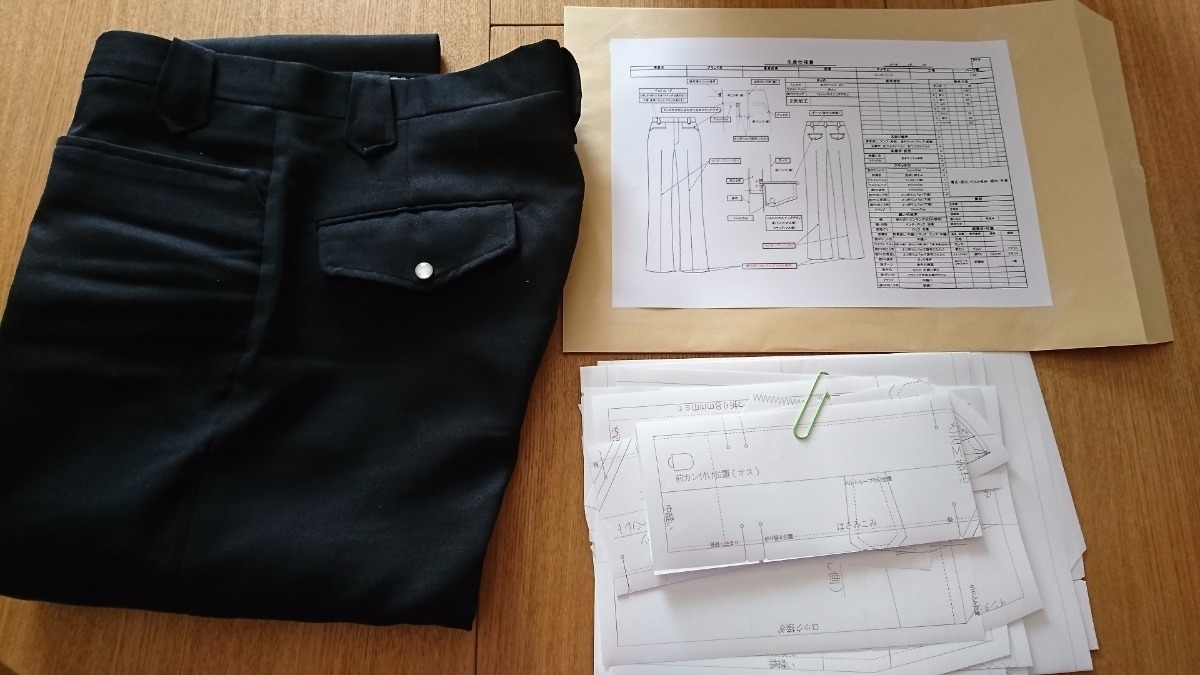 マーベルト仕様メンズパンツ 参考サンプル型抜きパターン作成 縫製仕様書作成