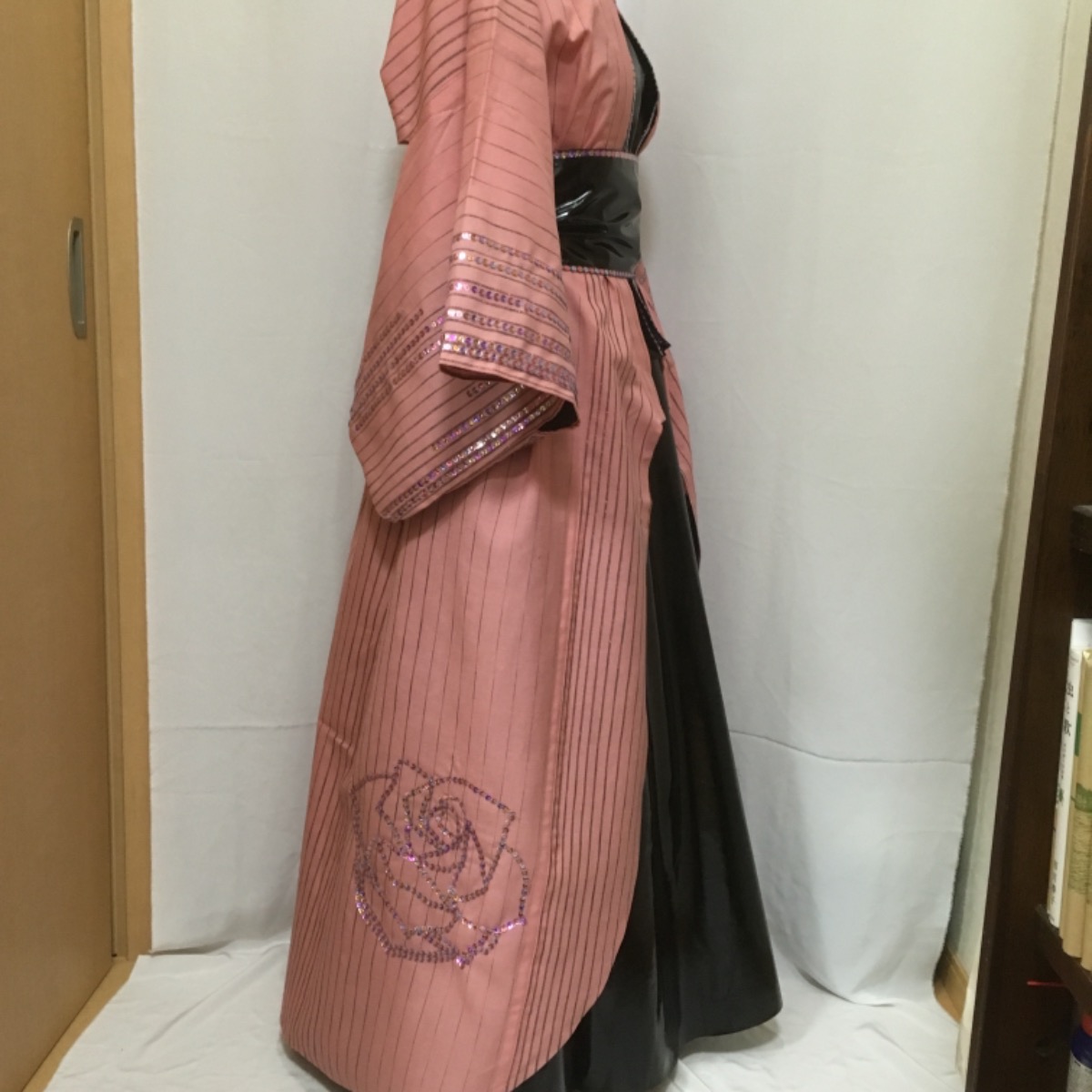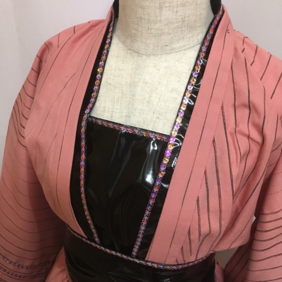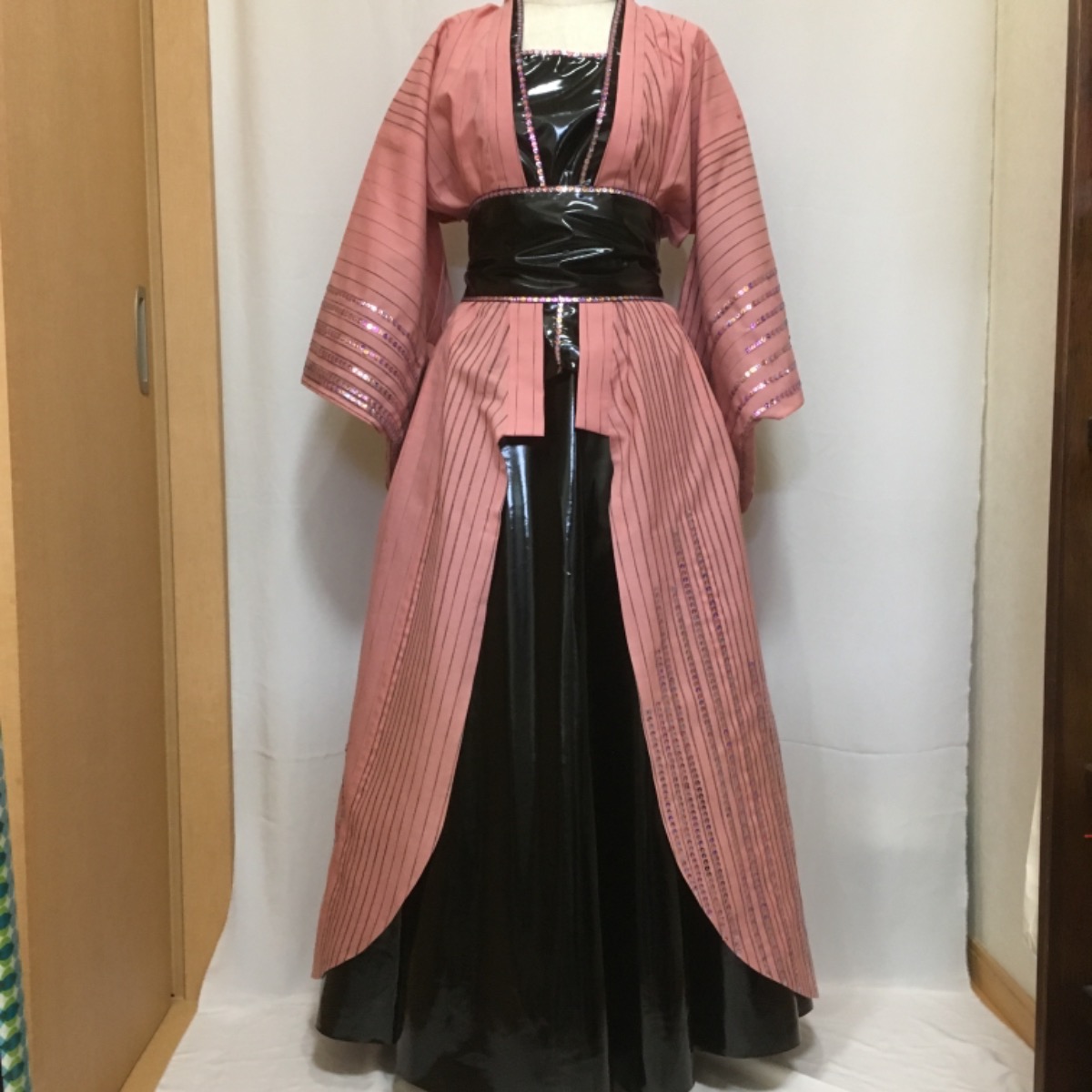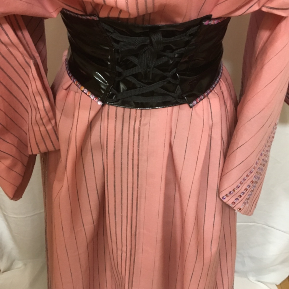 ライブ衣装1.着物かドレス風ロックで ポップ にと依頼され、エナメルスカートとスパンコールテープで飾り付け