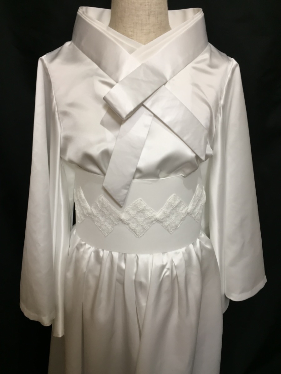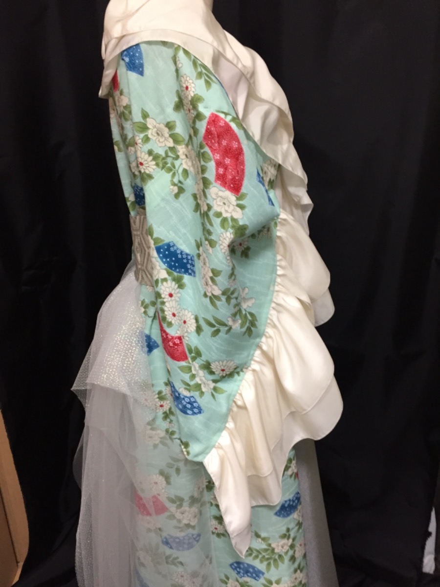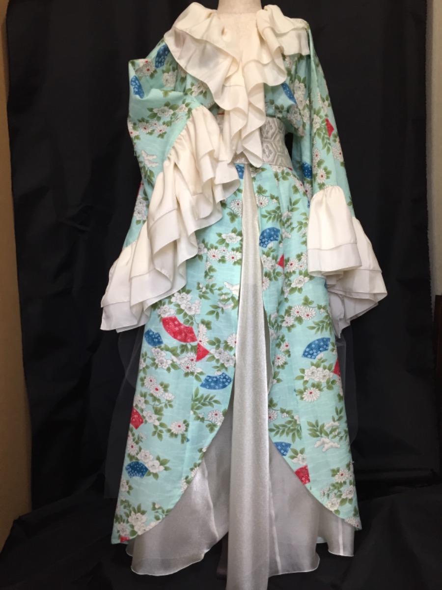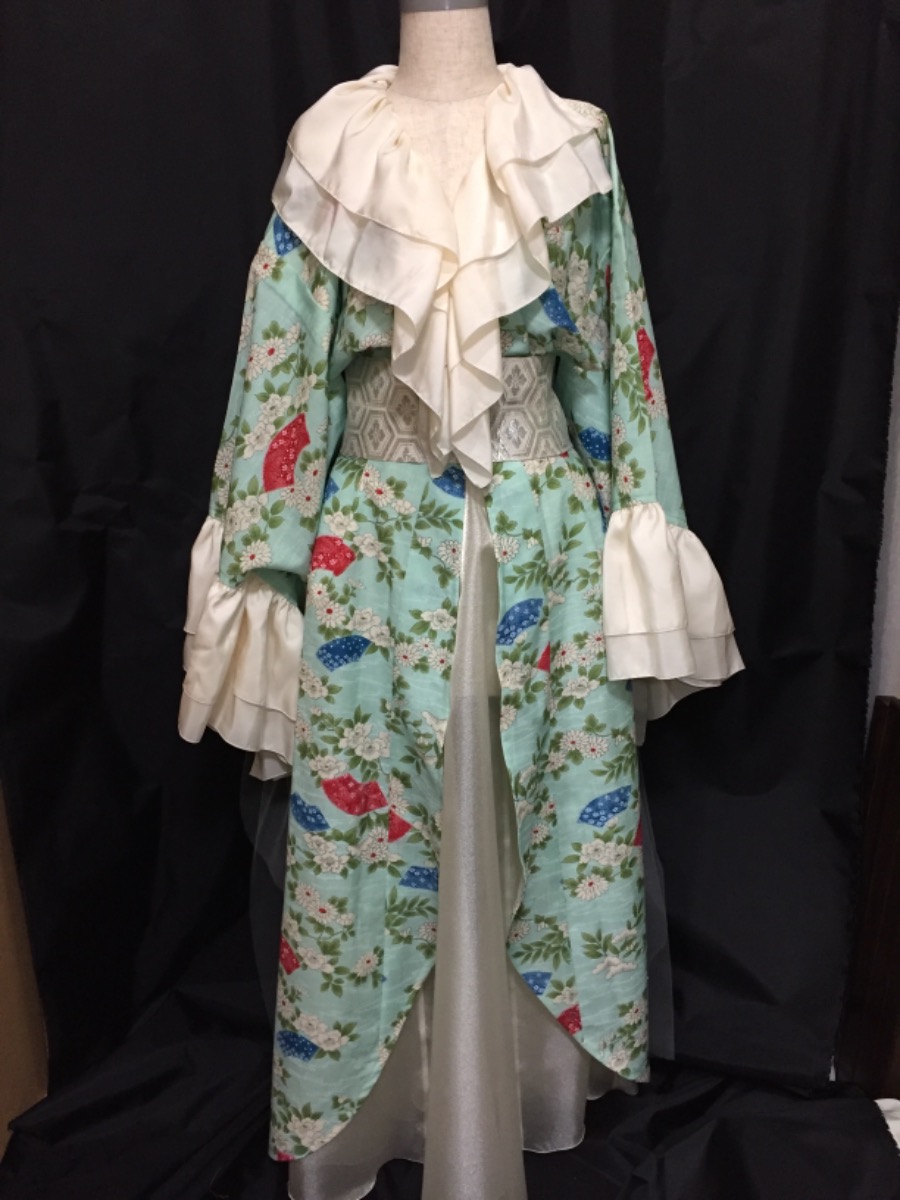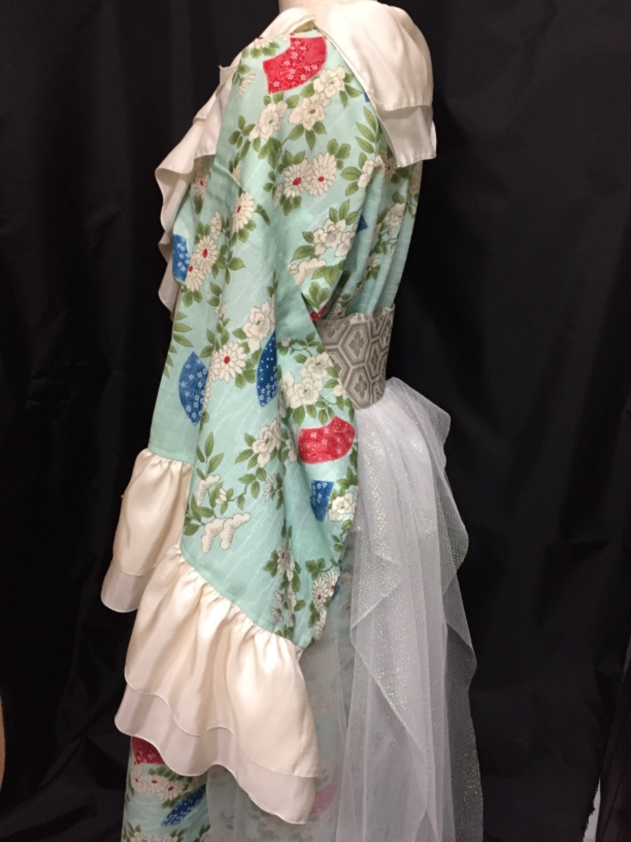 ライブ衣装2.着物からリメイクドレス風、可憐なイメージと依頼、オーガンジースカートと正絹の古布でフリル