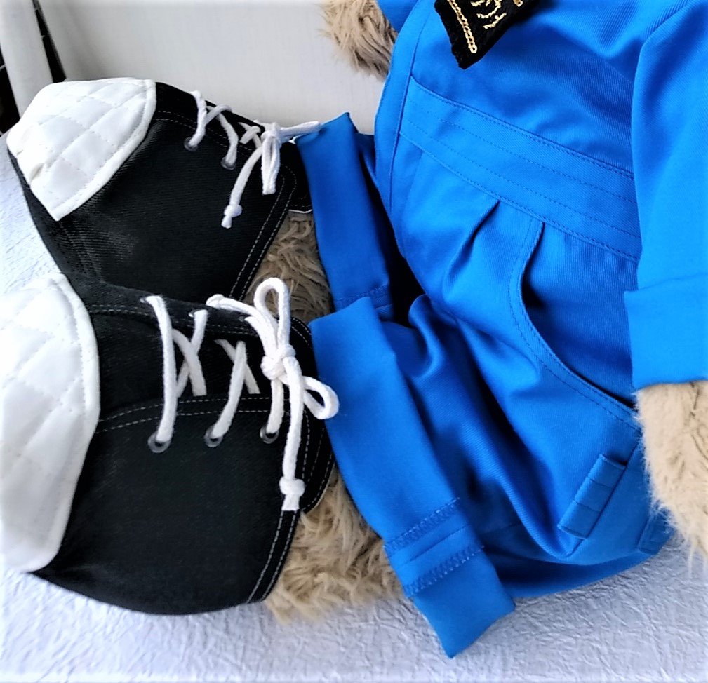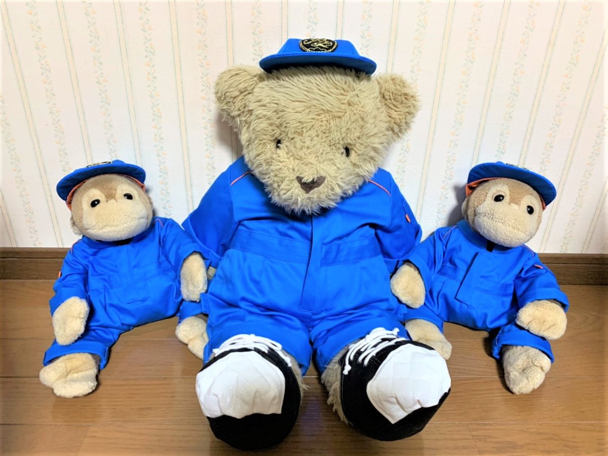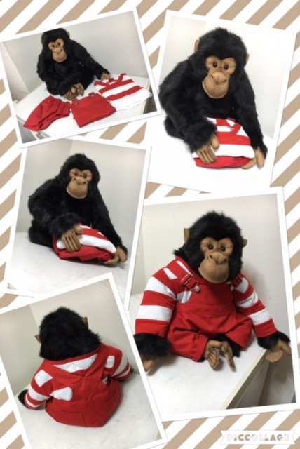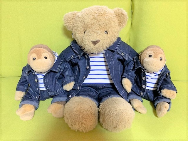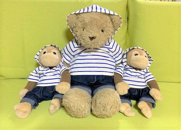 クマとサル2匹のぬいぐるみ衣装の作成、ツナギ、刺繍付き帽子、靴など