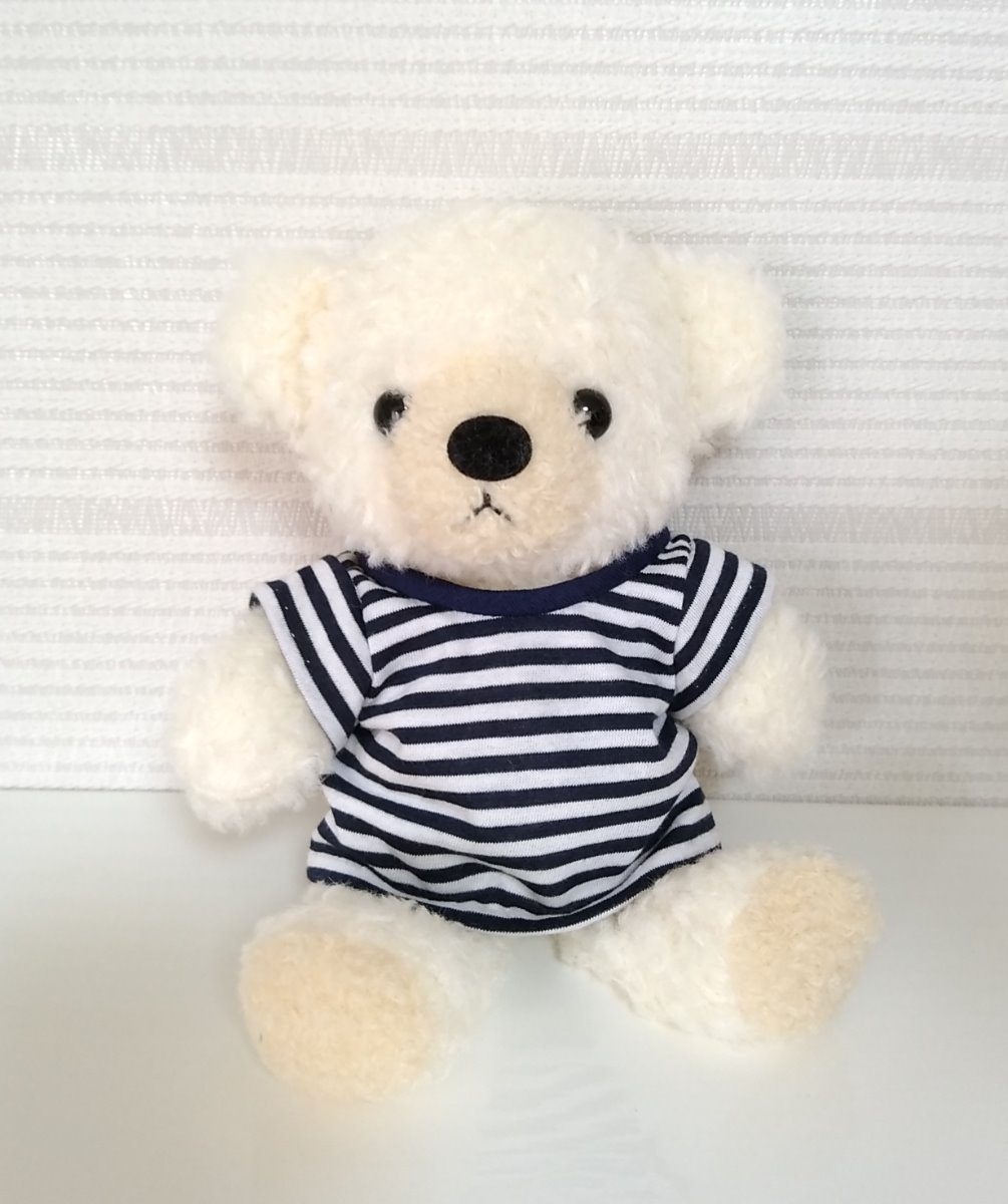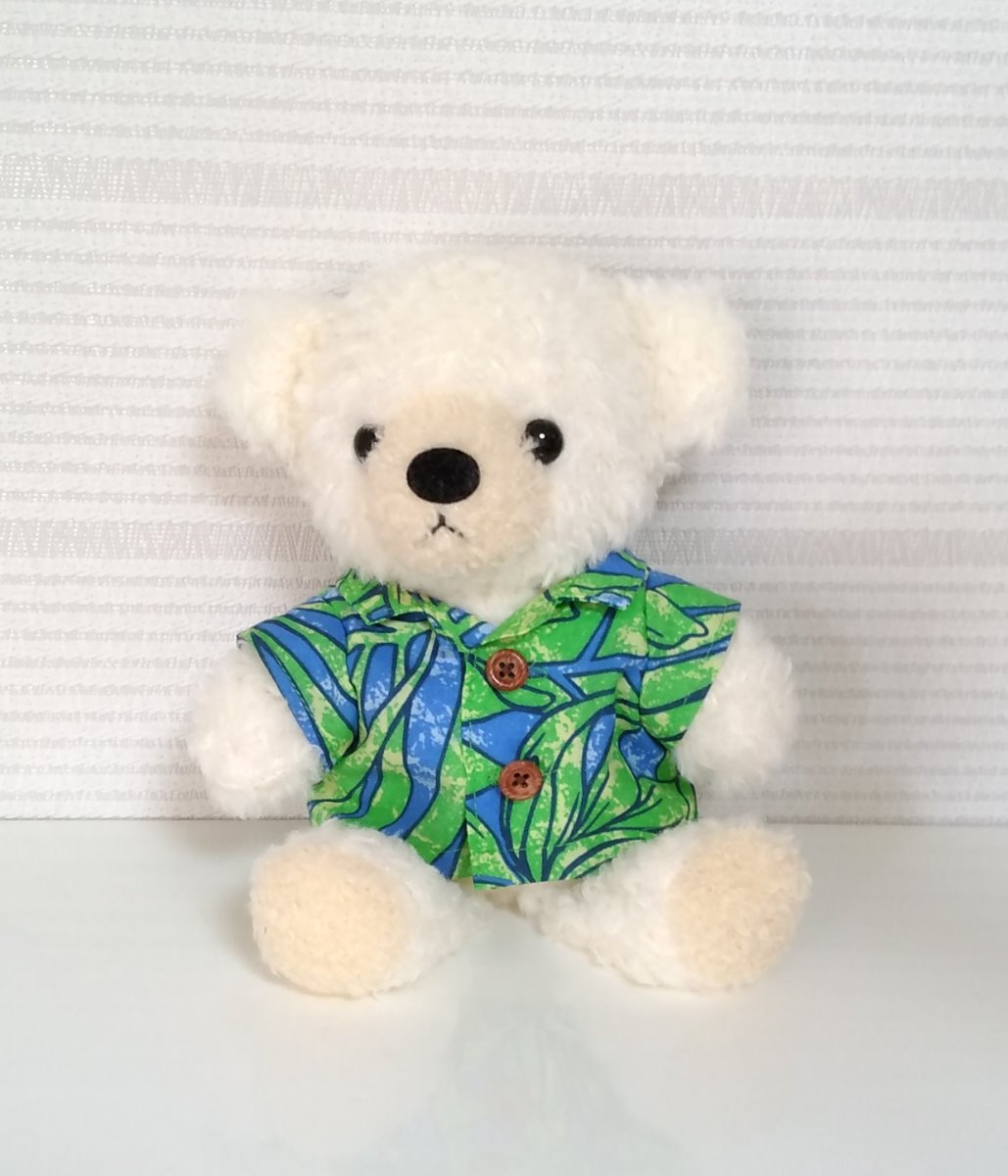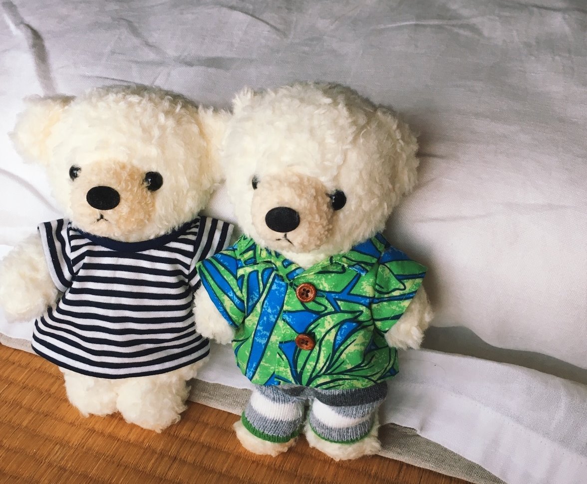 クマのぬいぐるみに着せるアロハシャツとボーダーTシャツ