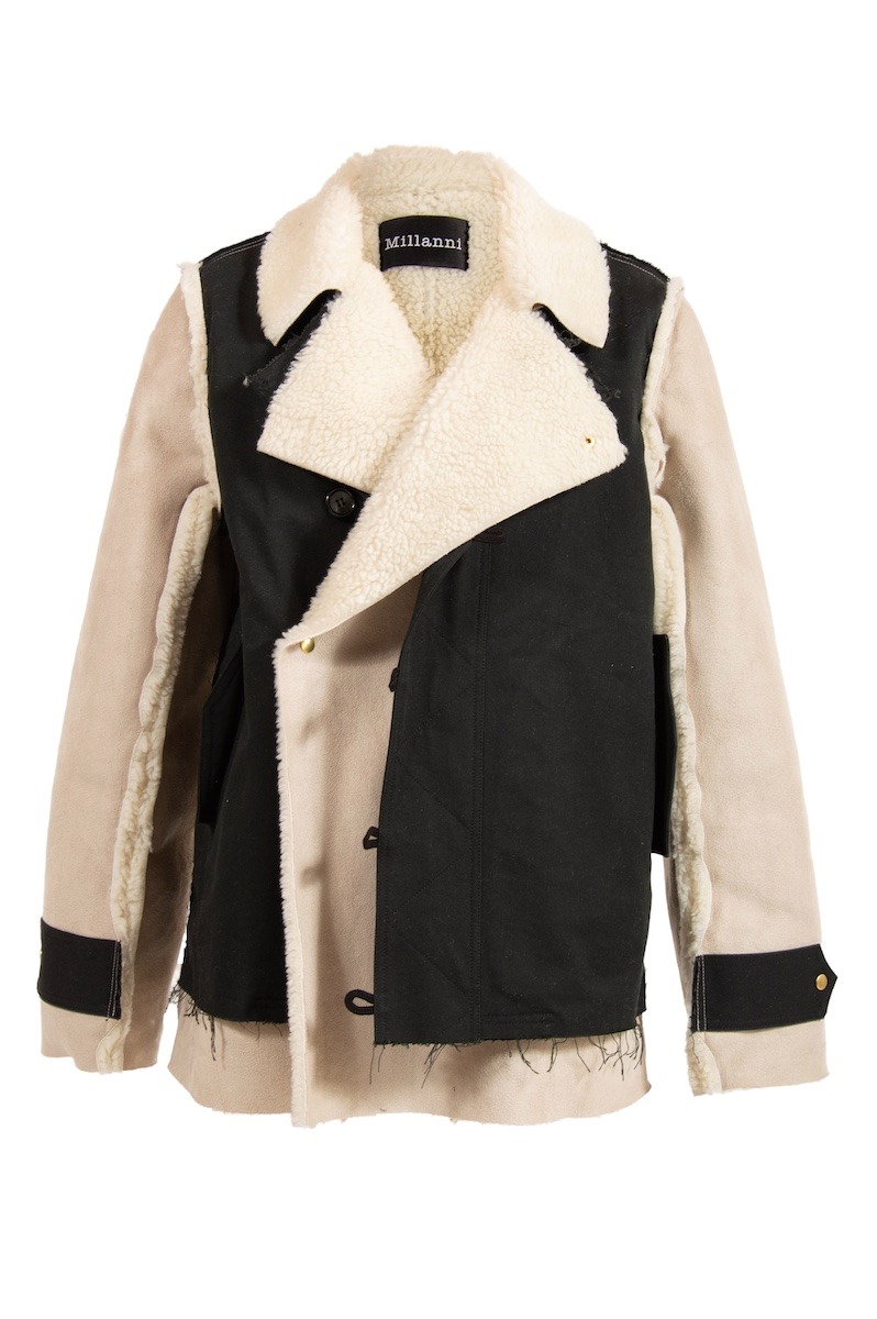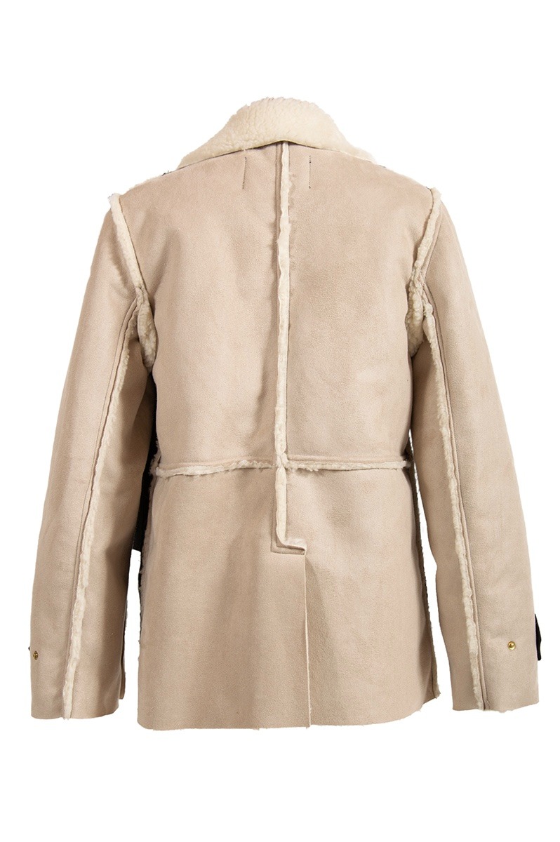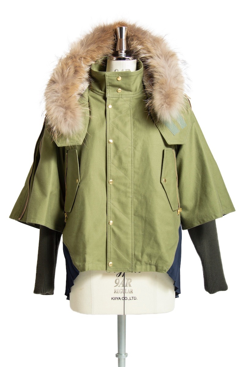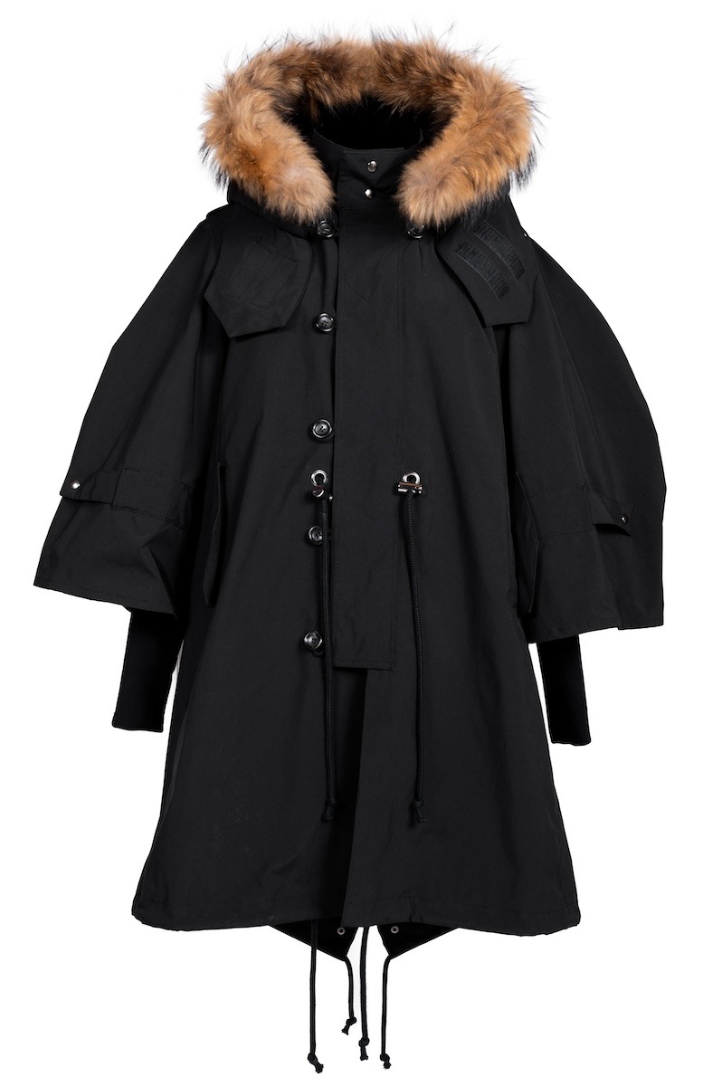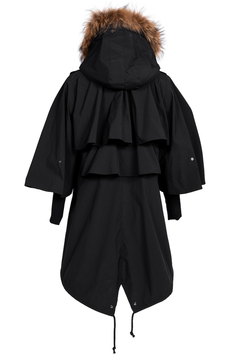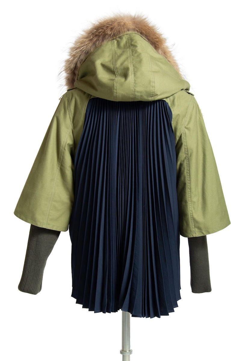 裏地、フード、ファーが取り外し可能のラクーンファーを使った、バックスタイルがプリーツのモッズコート