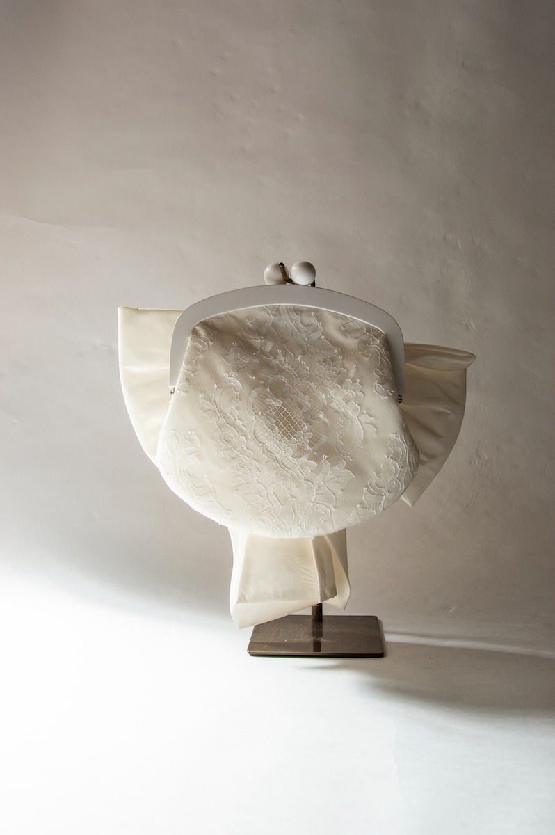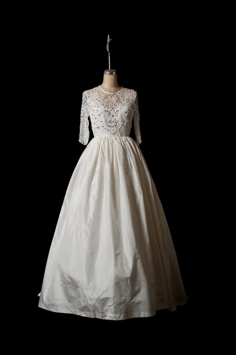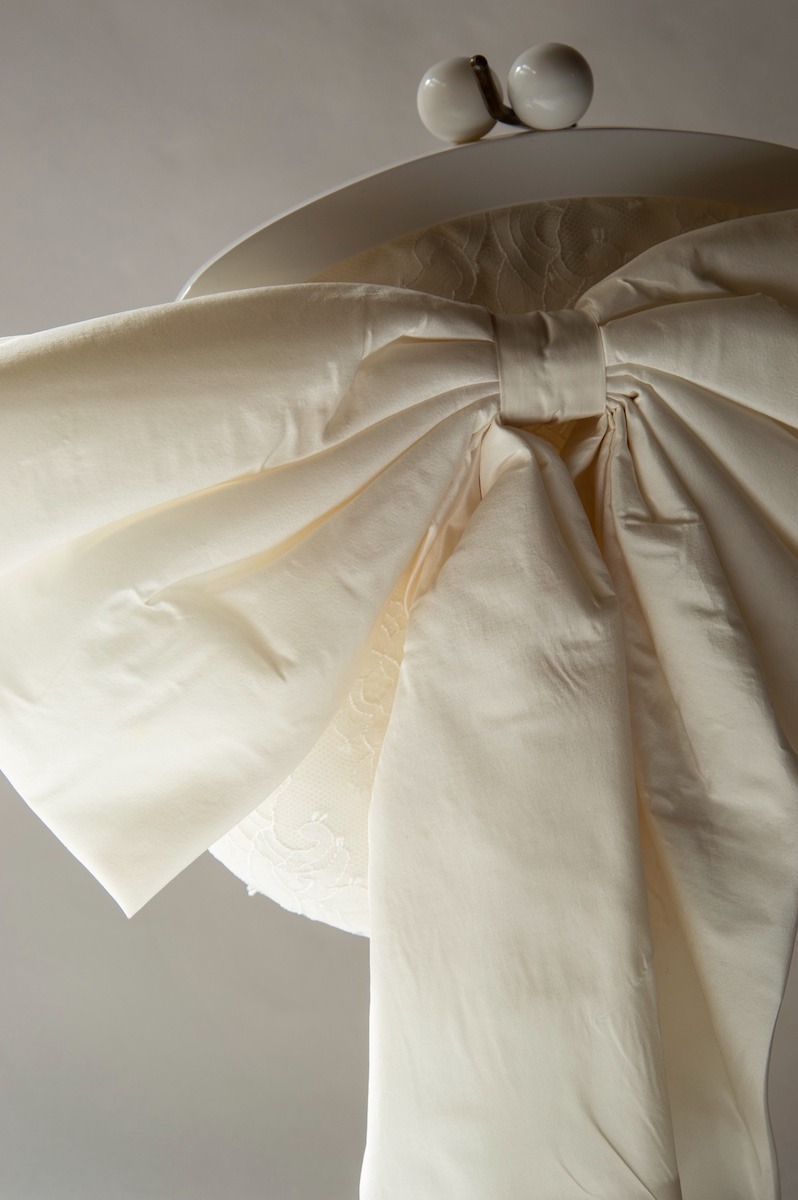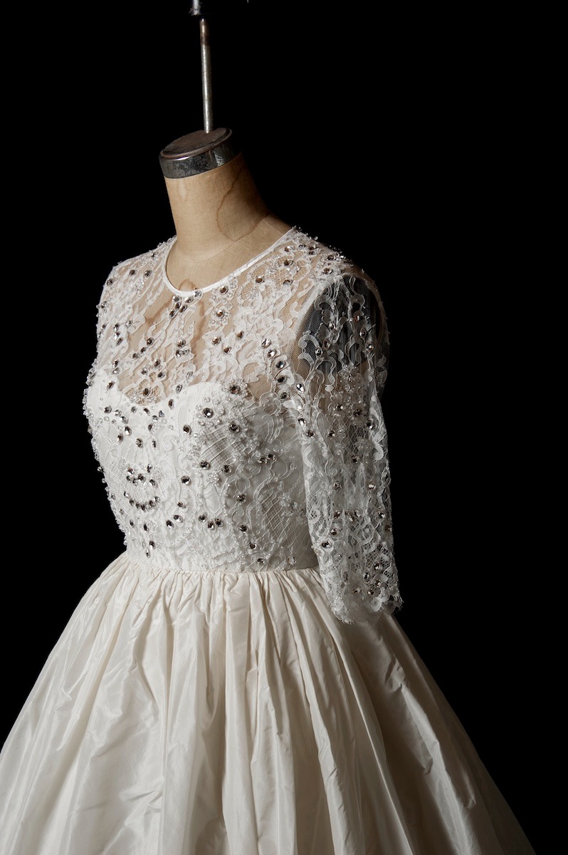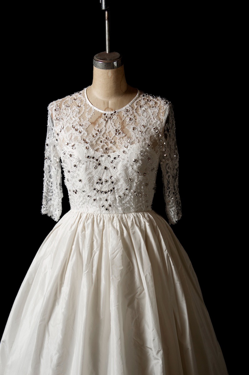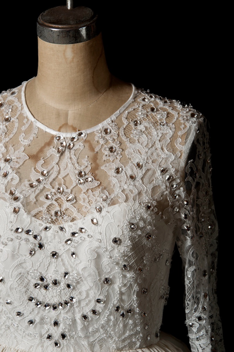 リバーレースの柄に合わせスワロフスキーを刺繍したウェディングドレス